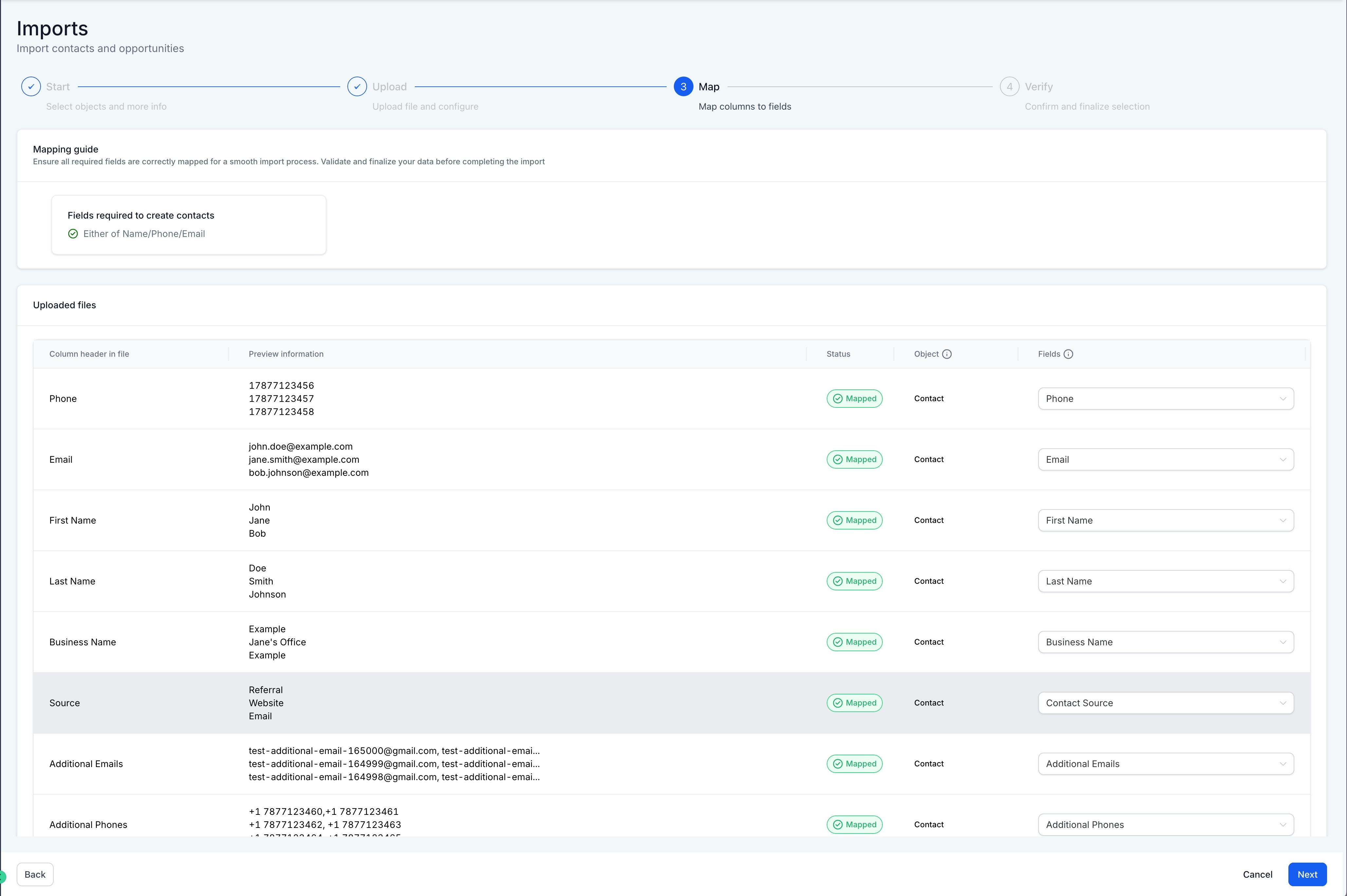 - At least one of the following fields is mandatory for creating a new contact: Name, Phone, or Email. Ensure these fields are included in your CSV and mapped correctly during the import process.