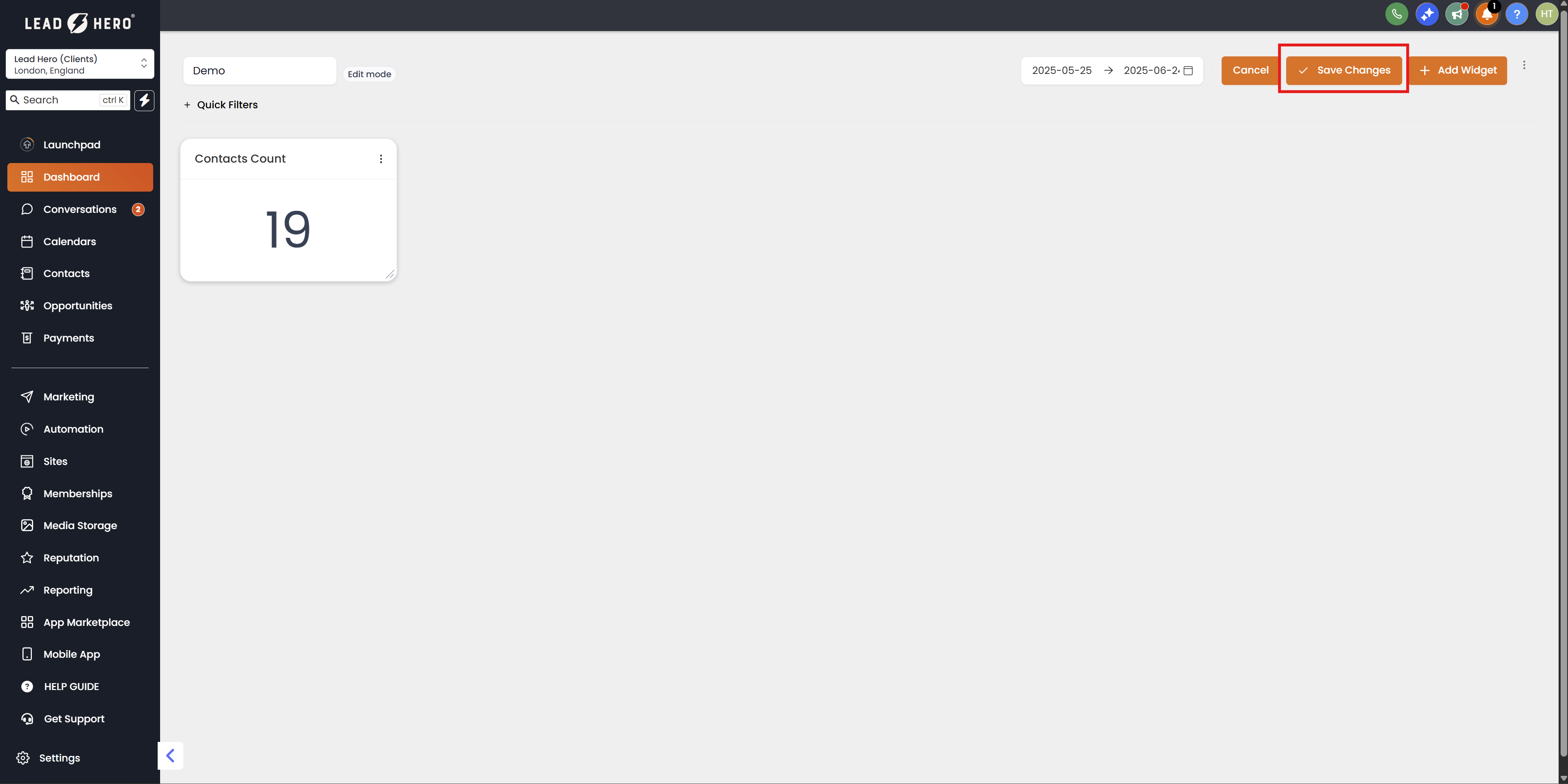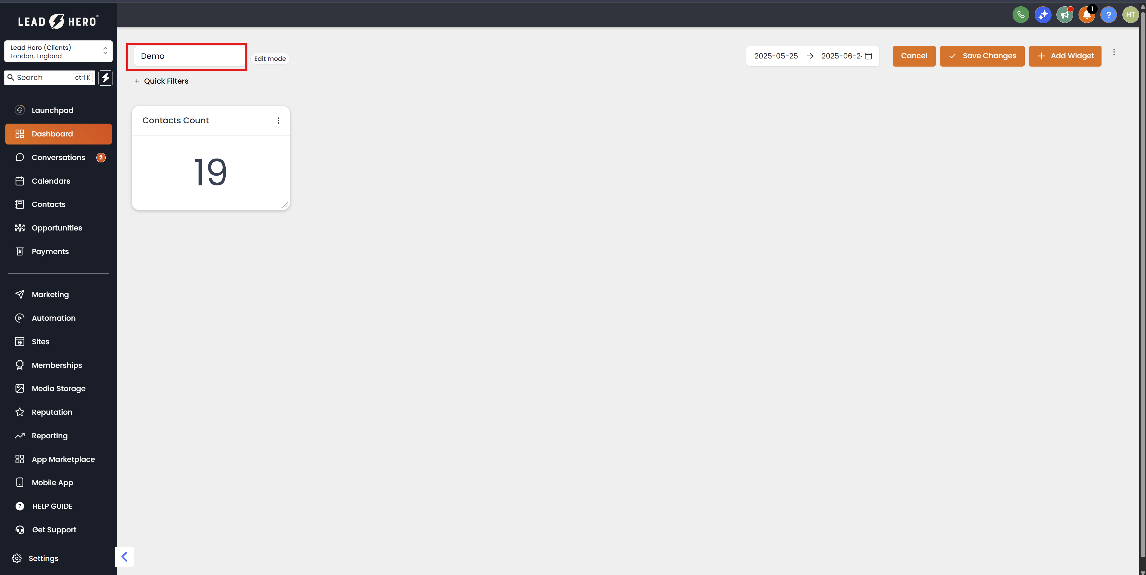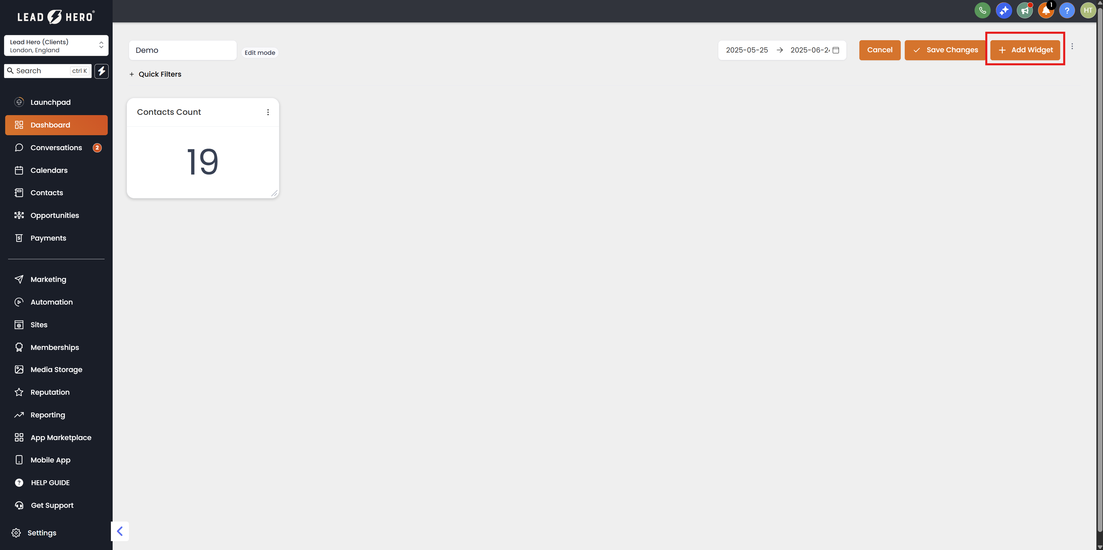 - Click on "Add Widgets" to introduce new custom widgets to your dashboard. For a detailed guide on adding custom widgets